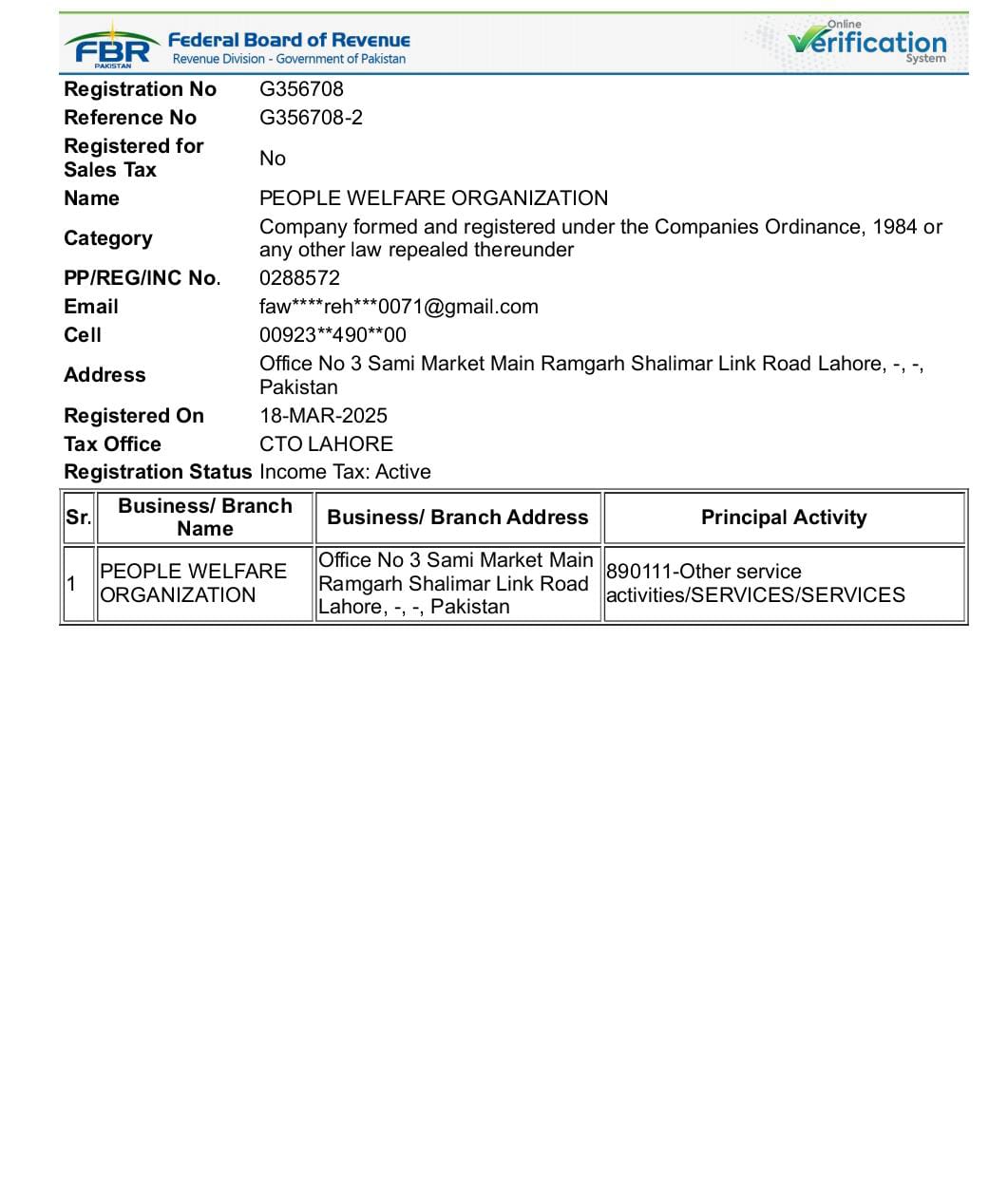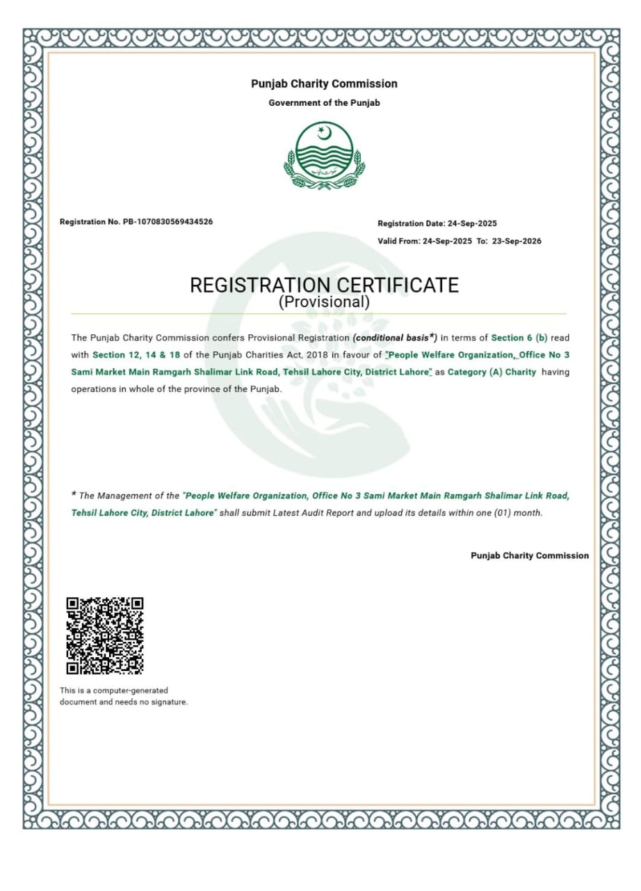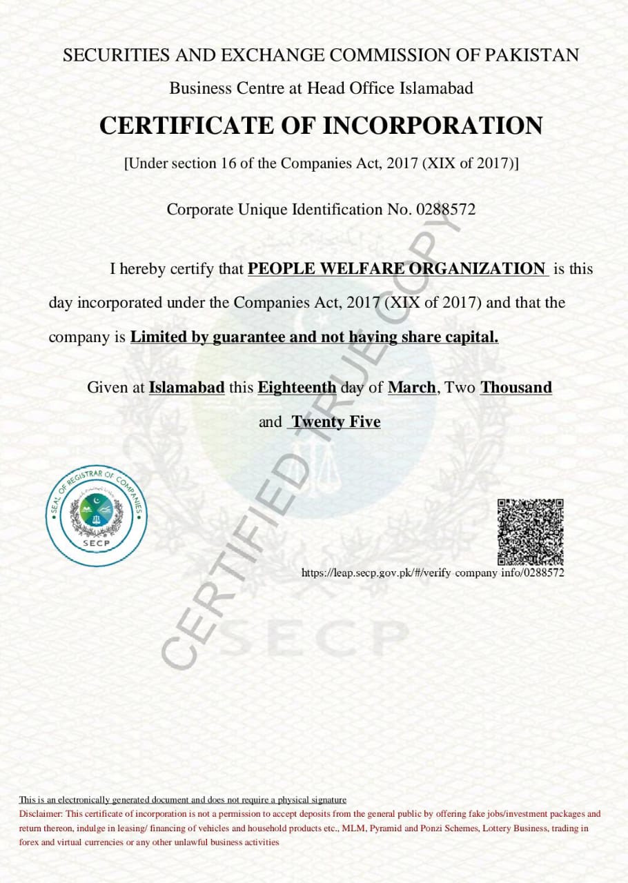 People Welfare Organization (PWO) is Certified as Incorporation with the Securities and Exchange Commission of Pakistan (SECP) with the Reference of Registeration Number 0288572